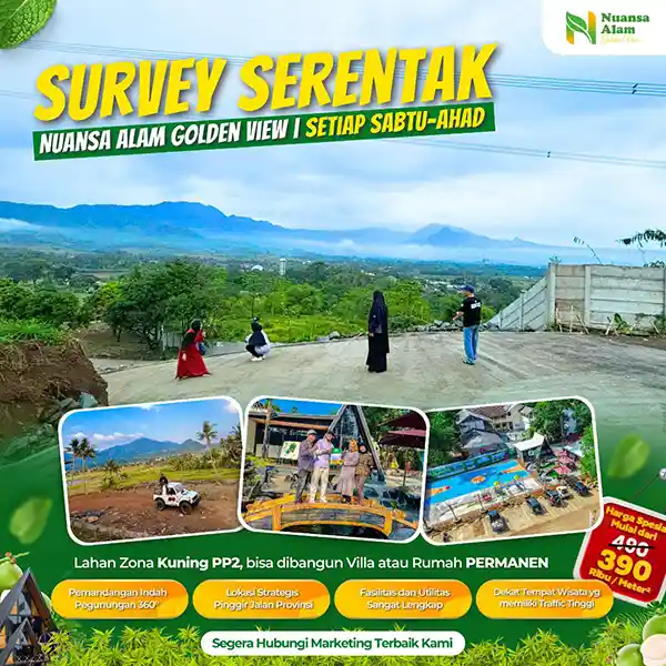 Setelah sukses mengembangkan 8 project sebelumnya, kini hadir kembali untuk anda: Nuansa Alam Golden View dengan konsep kavling villa keluarga. Dengan ini anda bisa memanjakan keluarga anda dari kepenatan kota dengan healing di villa yang anda bangun sendiri.